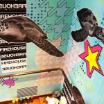- Montana Gold aerosol on interior wall | 52′ x 9′ | Left corner view of the mural | Completed April 2021 | “Geo #122” is located in the main dining area of The Fishin’ Pig in the Railroad District of Norfolk, VA. A huge thank you to Nash Osborn for inviting me to create the mural intuitively while interacting with the architecture and surroundings. Visit: https://www.fishinpig.com/norfolk