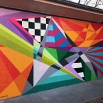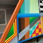 - “Geo #91” | 16′ x 9′ | Aerosol on block – Final full center image of the mural on the playground at Garcia Street Club School in Santa Fe, NM – Completed November 2018