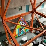 - “Geo #115” | 13′ x 13′ | Montana Gold aerosol on custom wood panel | View of the mural looking down from the 3rd level to the 2nd level through the metal sculpture | Completed November 2019