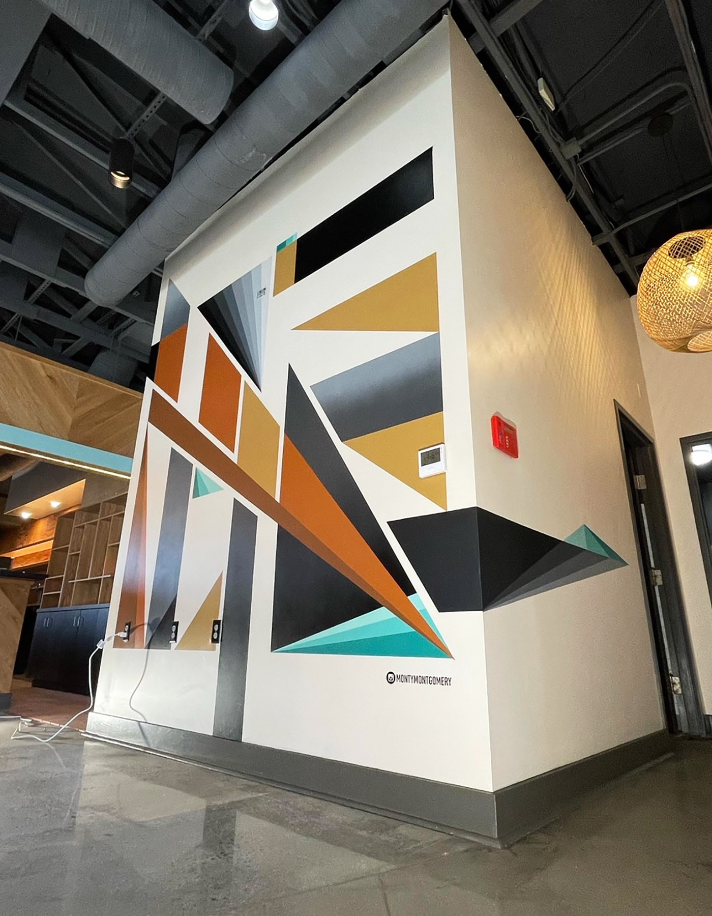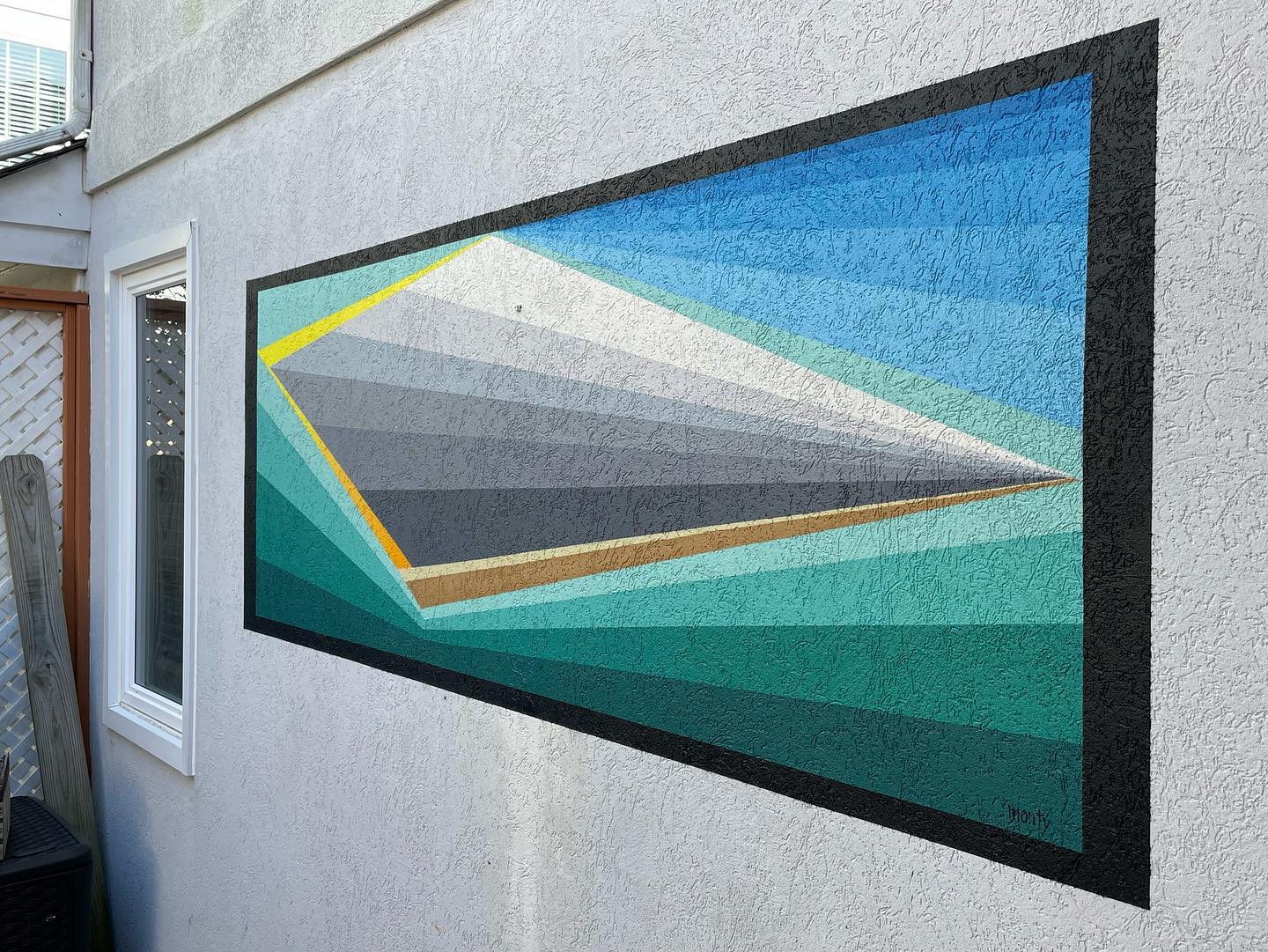 - “Moment #48” – 3’ x 8’ – Right angle view – montanacans aerosol with UV gloss varnish on exterior patio wall – Collectors private residence in Virginia Beach, Virginia. – 2021 . . #geometricabstraction #geometricnature #abstractnature #hardedgepainter #hardedger #montanacans #muralism #montymontgomery #montymontgomeryart